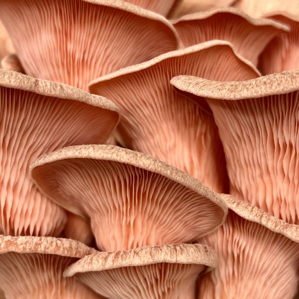 Pink Oysters are a vibrant, tropical variety, with a woody, nutty flavor and a firm texture. is a delicate, crispy mushroom with a nutty and buttery flavor. They work great when roasted or sautéed, and can add a colorful flare to your plate.